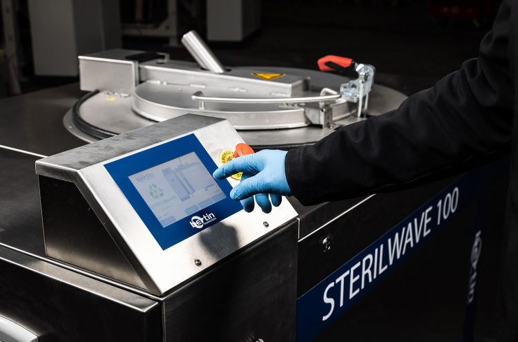 Biohazardous waste is sterilised with microwaves (heat it up to 110°C for 20 minutes) and allows microbial inactivation of up to 8log10.